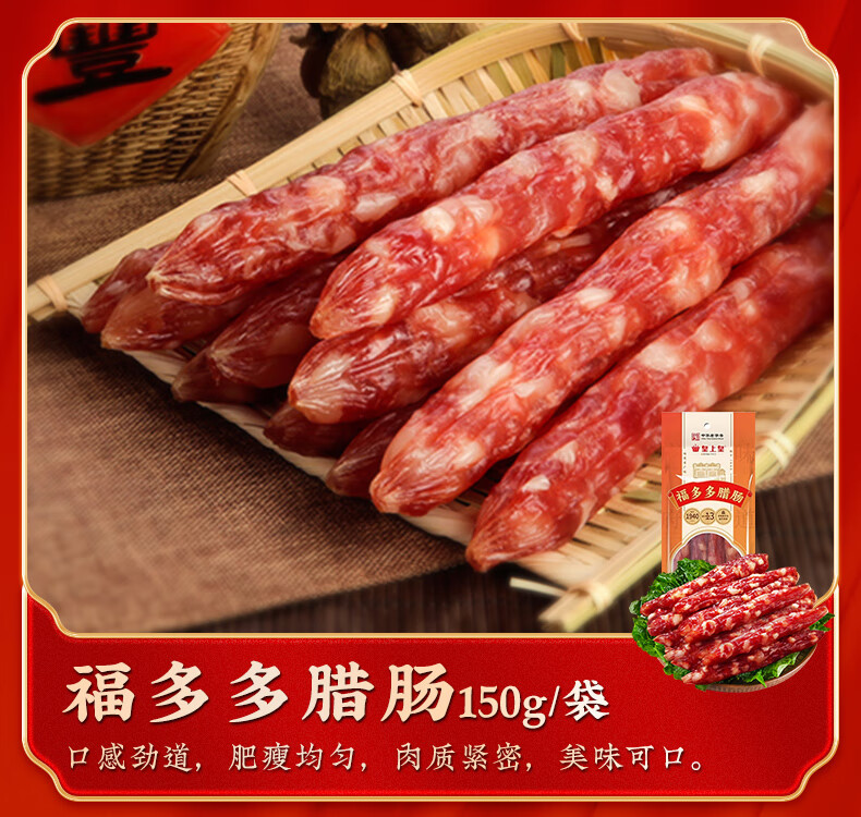 產(chǎn)地:廣東 特產(chǎn)品類:廣式臘腸 口味:原味 食用方法:烹飪食用 加工工藝:烘干 保質(zhì)期:120天 內(nèi)配:風(fēng)干臘鴨700g*1 廣味臘腸150g*1 福多多臘腸150g*2 三鮮臘腸200g*1 香荔臘腸250g*1 農(nóng)家柴火臘肉200g*1 廣式臘味禮盒*1